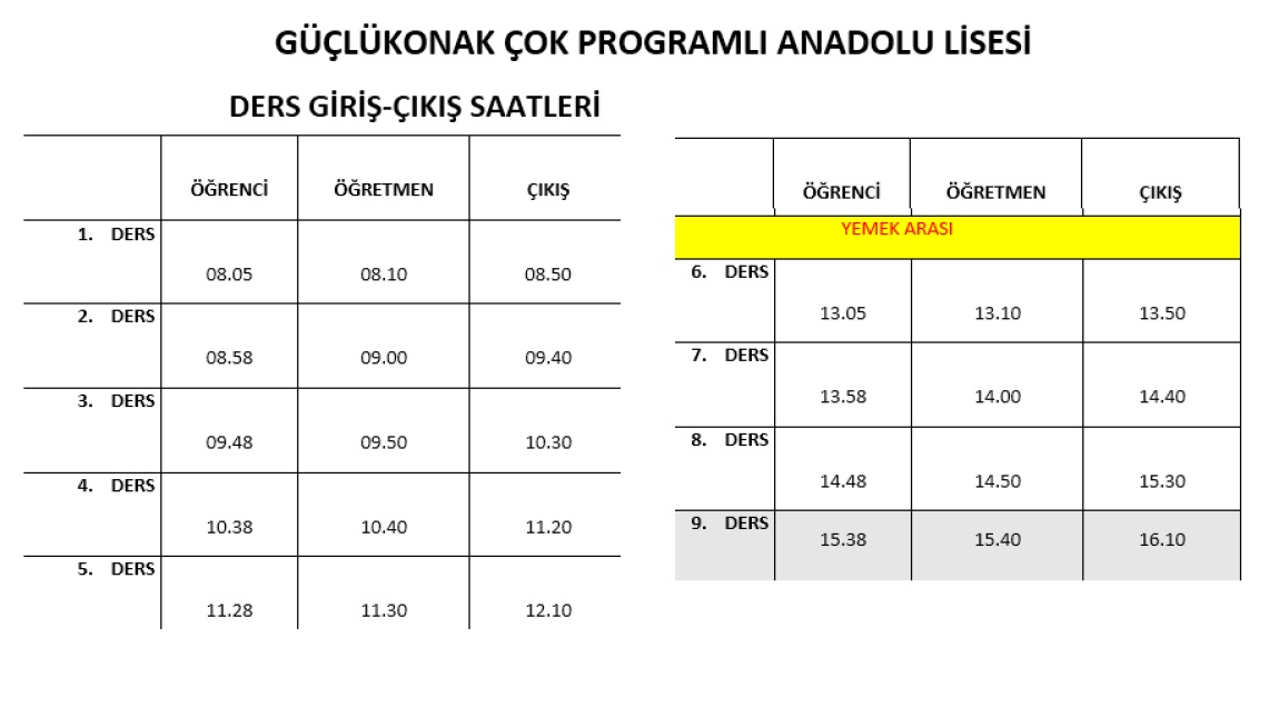 DERSLERİMİZ SAAT 08:00 DA BAŞLAYACAK OLUP ÇIKIŞ SAATİMİZ 16.10 DİR